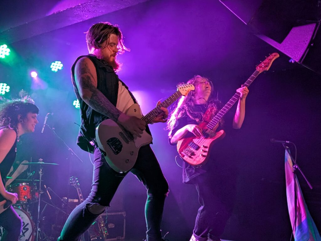 In keeping with the name of their tour, Millie Manders And The Shutup hit the stage – itself decked out with Palestine and Transgender Pride flags – to the ‘Back To The Future’ score before launching into anti-killjoy song ‘Fun Sponge’ (with many of the crowd wielding sponges throughout), ‘Windows’ and brutal renditions of the mad-at-the-world anthems ‘Angry Side’ and ‘Shut Your Mouth’. Millie donned her saxophone next for ‘Obsession Transgression’, followed by a blistering rendition of the never more relevant ‘Can I Get Off?’ and Millie got the crowd off their feet with plenty of pogo’ing throughout ‘Panic’.